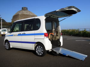 車いすごとスロープで乗車できます。車いすの方1名と、別に1名が助手席に乗車できます。料金は、普通車タクシーと同じです。 |